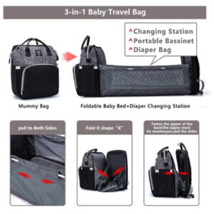 Όμορφη και πρακτική τσάντα πλάτης-πτυσσόμενο κρεβάτι σε σχέδιο animal print και χρώμα μαύρο-γκρι, ιδανική για αξέχαστες βόλτες με την οικογένειά σας! Διαθέτει μια μεγάλη κύρια θήκη με 4 ανοιχτές τσέπες και άλλες δύο με φερμουάρ. Είναι κατάλληλη για να αποθηκεύετε πάνες, μωρομάντηλα καθώς και μπιμπερό, μιας και περιλαμβάνει δύο εξωτερικές υποδοχές για παγούρι ή μπιμπερό και άλλες τρεις (στην μπροστινή τσέπη) ιδανικές για μπιμπερό. Ακόμα, έχει ρυθμιζόμενους ιμάντες και λαβή για να την μεταφέρετε με ευκολία και άνεση! Το πίσω μέρος της ανοίγει και γίνεται κρεβατάκι, για να ξεκουράζεται το μωρό σας όπου κι αν βρίσκεστε! – Κλείσιμο με φερμουάρ στο επάνω μέρος. – Κλείσιμο με κούμπωμα στις λαβές. – Μπροστινή τσέπη με φερμουάρ (με 3 μονωμένες ισοθερμικές τσέπες για μπουκάλια και δικτυωτή τσέπη εσωτερικά). – Κύρια θήκη: 4 ανοιχτές τσέπες, μια τσέπη με φερμουάρ στον τοίχο, μια αδιάβροχη τσέπη με φερμουάρ και ένα κλιπ για το κλειδί. – Φερμουάρ πίσω στην κύρια θήκη. – Πλαϊνές υποδοχές για παγούρι-μπιμπερό. – Ρυθμιζόμενοι ιμάντες ώμου με επένδυση. Η τσάντα ανοίγει από πίσω και γίνεται κρεβατάκι. Διαστάσεις: -Ύψος: 41 εκ. -Μήκος: 26 εκ.